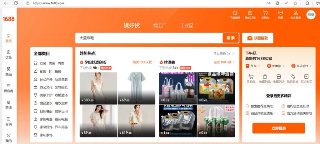 1688 es el «Alibaba para chinos». Es una plataforma B2B enfocada al mercado interno de China. Aquí encontrarás miles de proveedores con precios más bajos que en Alibaba.